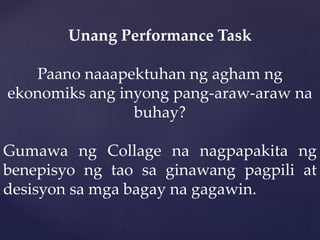 Mga Nilalaman Paksa Aralin. Ang mga-aaral ay naisasabuhay ang mga pag-unawa sa mga pangunahing konsepto ng Ekonomiks bilang batayan ng matalino at maunlad na pang-arawaraw na pamumuhay. Nagiging balakid ang mga isyung may kinalaman sa ekonomiya sa mga Pilipino higit kung ito ay tungkol sa presyo ng bilihin dami ng trabaho o paghina ng panalalapi ng bansa.