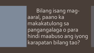 Ang karapatang maging malaya sa pagpapahirap. Karapatan ng kabataan sa ililim ng 1987. Ang karapatang pantao ng isang indibidwal ang mga bagay na nagbibigay sa kanyang ng natural na karapatan upang mamuhay na tulad ng ibang tao nakasaad dito ang mga karapatan niya bilang isang mamamayan ng bansang Pilipinas tulad ng karapatan sa edukasyon karapatan sa pagpapahayag at higit sa lahat karapatang tumira at mamuhay sa bansang ito.