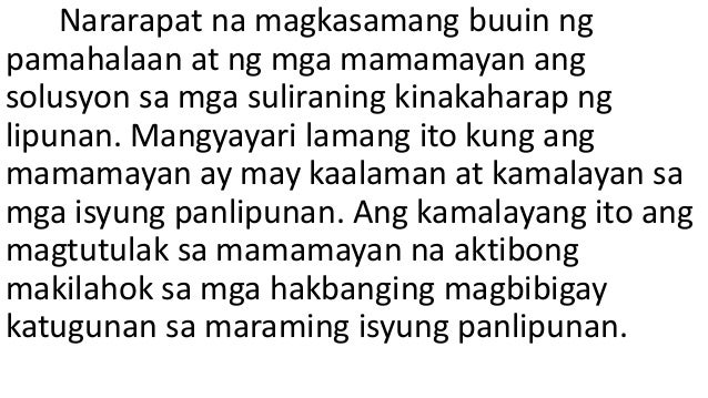 Nakakatulong ito sa kanila upang mas maunawaan ang mga isyung panlipunan na nakakaapekto sa kanilang buhay at ang kanilang papel sa paglutas nito. Una sila ang nagsisilbing tagapamahala kung maayos at maunlad ba ang ekonomiya ng bansa. Sa maraming demokratikong bansa gaya ng Pilipinas mayroong tatlong sangay ng pamahalaan.