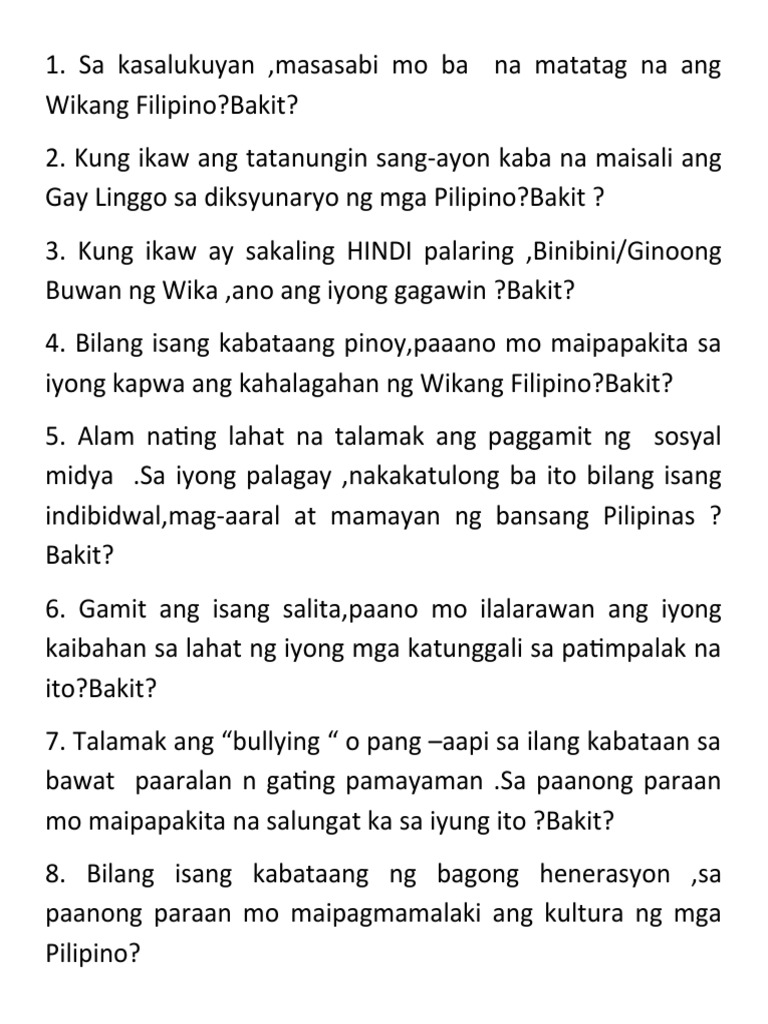 Niccherip5 and 5 more users found this answer helpful. Ibat-ibang wika sa bawat lugar komunidad at bansa. Andrew Gonzales na mahalaga talaga ang wikang Filipino sa negosvo at industriya.