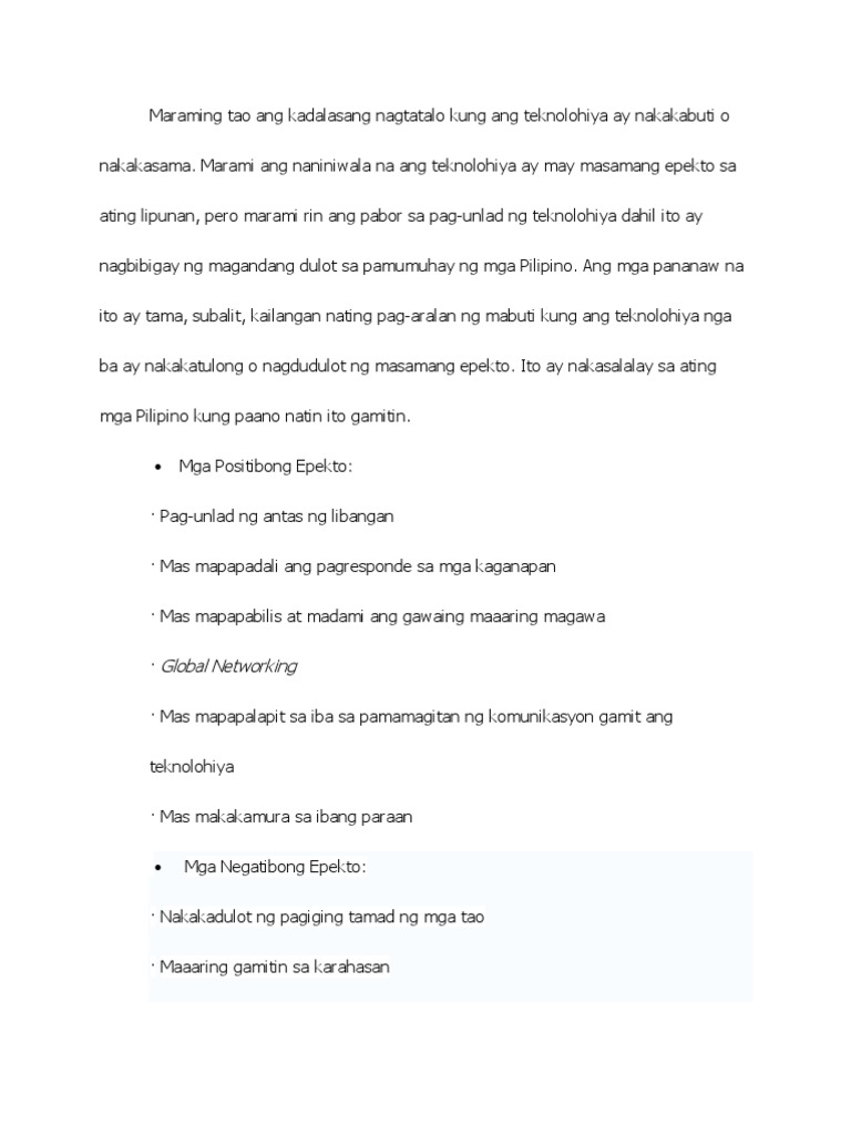 Ngunit sa pagkakataong ito maraming tao din ang nagtatalo kung makakabuti ba o makakasama ang mga makabagong teknolohiya ito sa pag-aaral ng mga kabataan. Marami ang naniniwala na ang teknolohiya ay may masamang epekto sa ating lipunan pero marami rin ang pabor sa pag-unlad ng teknolohiya dahil ito ay nagbibigay ng magandang dulot sa pamumuhay ng mga Pilipino. 645 5806 3226 322 0 100 6.